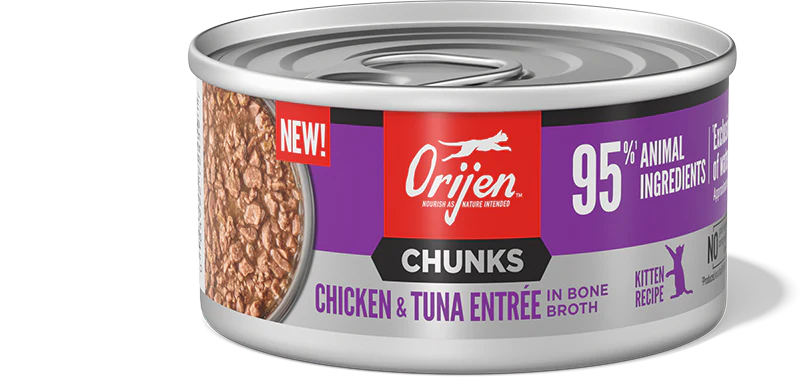 Nourish your kitten completely with the hearty WholePrey animal ingredients in ORIJEN™ Chunks Kitten Entrée! Kittens are obligate carnivores, meaning they thrive off a diet packed with real animal ingredients. That’s why this Kitten Entrée recipe is Biologically Appropriate and includes a whopping 95% animal ingredients, including chicken and tuna, to help support your growing kitten’s muscle development. This diet also includes succulent WholePrey ingredients such as chicken liver to provide your kitten with the nutrients they need to grow up strong. Kittens need to stay hydrated to thrive, and bone broth helps add necessary moisture to their diet with every bite. Help support your kitten’s development with the variety of raw animal ingredients packed into every can of ORIJEN™ Chunks!