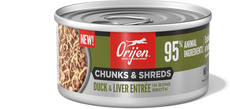 Nourish your cat completely with hearty WholePrey animal ingredients and real shreds of meat, poultry or fish in ORIJEN™ Chunks & Shreds Wet Cat Food! Cats are obligate carnivores, so they thrive off a diet packed with animal ingredients. That’s why this Duck & Liver Entrée recipe includes a whopping 95% animal ingredients to provide your cat with the Biologically Appropriate nourishment they were born to eat. This diet also includes succulent WholePrey ingredients such as chicken liver to provide your cat with rich and varied nutrients. Bone broth helps support your cat’s hydration, while also adding tempting flavour. Nourish your cat with the texture and variety of raw animal ingredients packed into every can of ORIJEN™ Chunks & Shreds.