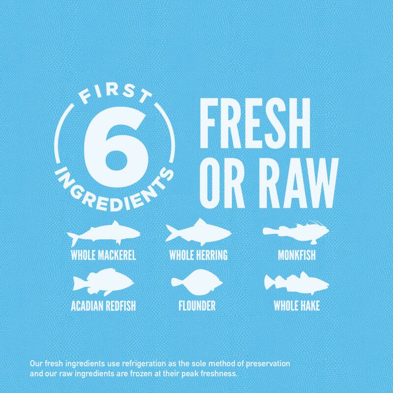 Fresh whole Pacific pilchard (18%), fresh whole Pacific mackerel (13%), fresh whole Pacific hake (12%), fresh whole Pacific flounder (5%), fresh whole rockfish (5%), fresh whole sole (5%), whole mackerel (dehydrated, 5%), whole herring (dehydrated, 5%), Alaskan cod (dehydrated, 4.5%), whole sardine (dehydrated, 4.5%), whole blue whiting (dehydrated, 4%), herring oil (4%), whole red lentils, whole green lentils, whole green peas, lentil fibre, whole chickpeas, whole yellow peas, sunflower oil (cold-pressed), whole pinto beans, cod liver (freeze-dried), fresh whole pumpkin, fresh whole butternut squash, fresh whole zucchini, fresh whole parsnips, fresh carrots, fresh whole Red Delicious apples, fresh whole Bartlett pears, fresh kale, fresh spinach, fresh beet greens, fresh turnip greens, brown kelp, whole cranberries, whole blueberries, whole Saskatoon berries, chicory root, turmeric root, milk thistle, burdock root, lavender, marshmallow root, rosehips, enterococcus faecium. ADDITIVES (per kg): Nutritional additives: Zinc chelate: 100 mg; Copper chelate: 11 mg.