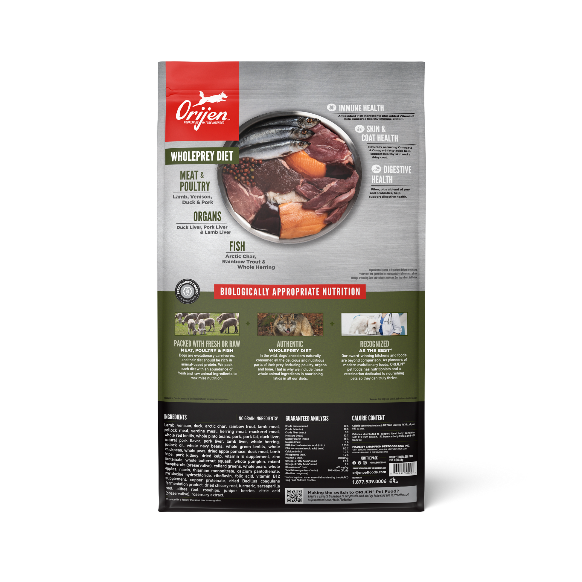 - WHOLEPREY MEAT RATIOS Nature matched the nutrients in whole prey animals to perfectly meet your cat and dog’s needs. ORIJEN’s WholePreyTM ratios of meat, organs and cartilage virtually eliminate the need for synthetic ingredients. CARBOHYDRATE-LIMITED Your pet’s natural diet is low in carbohydrates, so ORIJEN limits carbohydrates and replaces fast sugars like potato and tapioca with whole fresh fruits and vegetables, such as pumpkin and squash.