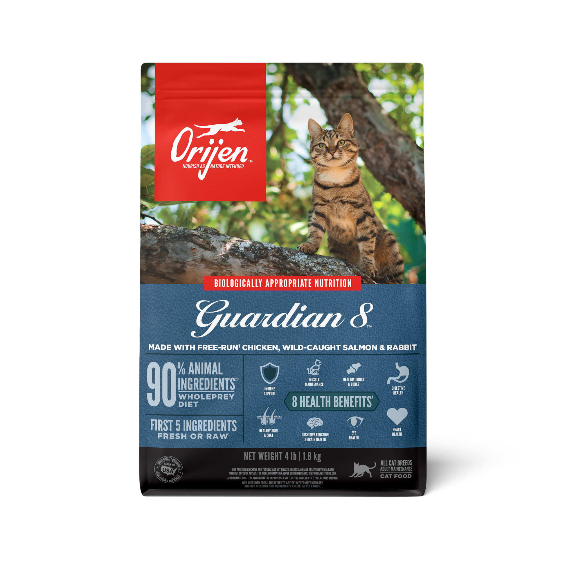 ORIJEN™ Guardian 8™ is a nourishing food specially formulated to address 8 common health concerns through quality ingredients. Because of the abundance of fresh and raw1 WholePrey animal ingredients in this diet, less supplementation is needed to support your cat's health for a lifetime. With 90%2 animal ingredients, Guardian 8 contains nutrient-rich fresh or raw animal ingredients that help support your feline’s health. These key health benefits include Immune Support, Digestive Health Support, Healthy Skin & Coat Support, Muscle Maintenance, Heart Health, Healthy Joints & Bones, Cognitive Function & Brain Health, and Eye Health.