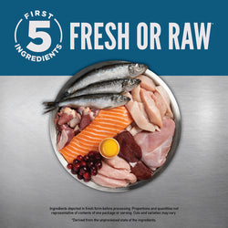 Chicken, salmon, turkey, whole herring, chicken liver, dehydrated chicken, dehydrated turkey, dehydrated sardine, dehydrated chicken liver, dehydrated egg, whole red lentils, whole pinto beans, turkey giblets (liver, heart, gizzard), eggs, rabbit, pollock oil, whole green lentils, whole navy beans, whole chickpeas, whole peas, ground miscanthus grass, natural chicken flavor, chicken fat, chicken hearts, whole cranberries, choline chloride, dried kelp, mixed tocopherols (preservative), whole pumpkin, whole butternut squash, collard greens, whole apples, whole pears, zinc proteinate, vitamin E supplement, dried chicory root, hydrolyzed yeast, dried brewers yeast, thiamine mononitrate, riboflavin, niacin, calcium pantothenate, pyridoxine hydrochloride, folic acid, vitamin B12 supplement, copper proteinate, dried Bacillus coagulans fermentation product, turmeric, sarsaparilla root, althea root, rosehips, juniper berries, citric acid (preservative), rosemary extract.