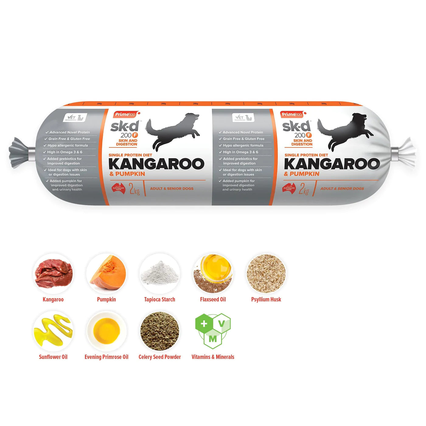 Kangaroo, pumpkin, tapioca starch, vitamins, minerals, flaxseed oil, psyllium husk, sunflower oil, evening primrose oil, salt, natural digestive enzymes, celery seed powder.
