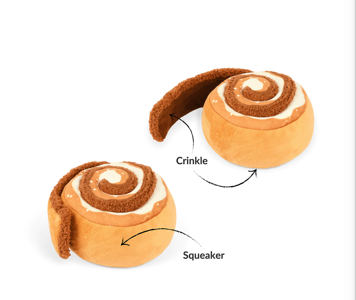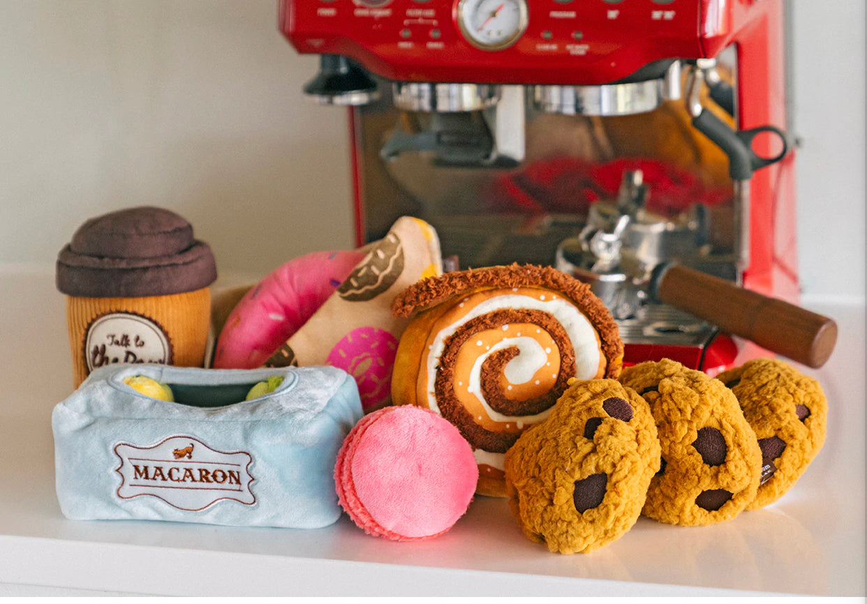 Fuel up for fun with P.L.A.Y.'s Pup Cup Café Plush Toy Collection, a full set of coffee shop themed toys for the energy-filled pup in your life. Dive into the swirls of a warm and flakey cinnamon roll toy for hours of unraveling fun, or spice it up with a fun sprinkled donut paired with their favorite go-to coffee beverage to wash it all down! As a lil snack for later, grab some classic chocolate chip cookies, connected by a rope perfect for tug-of-war or share some delectable macarons with furiends for a fancy game of Find-n-Seek.