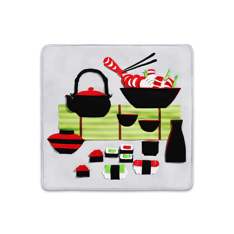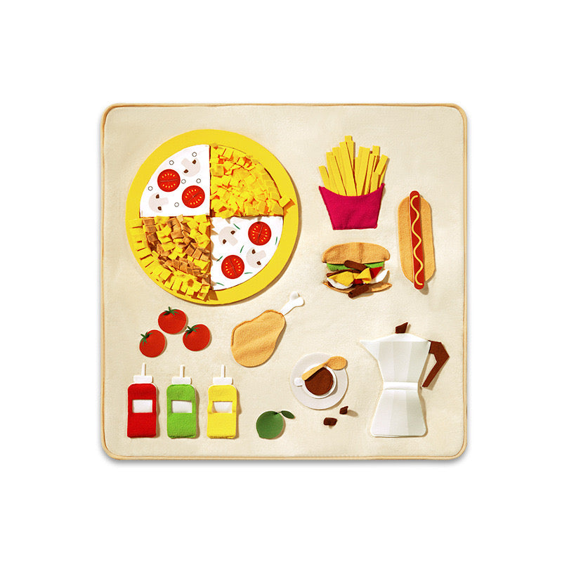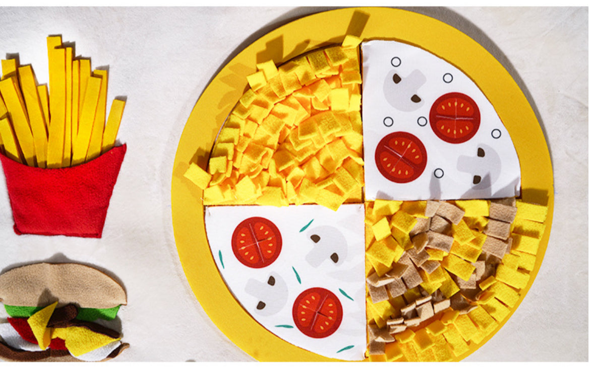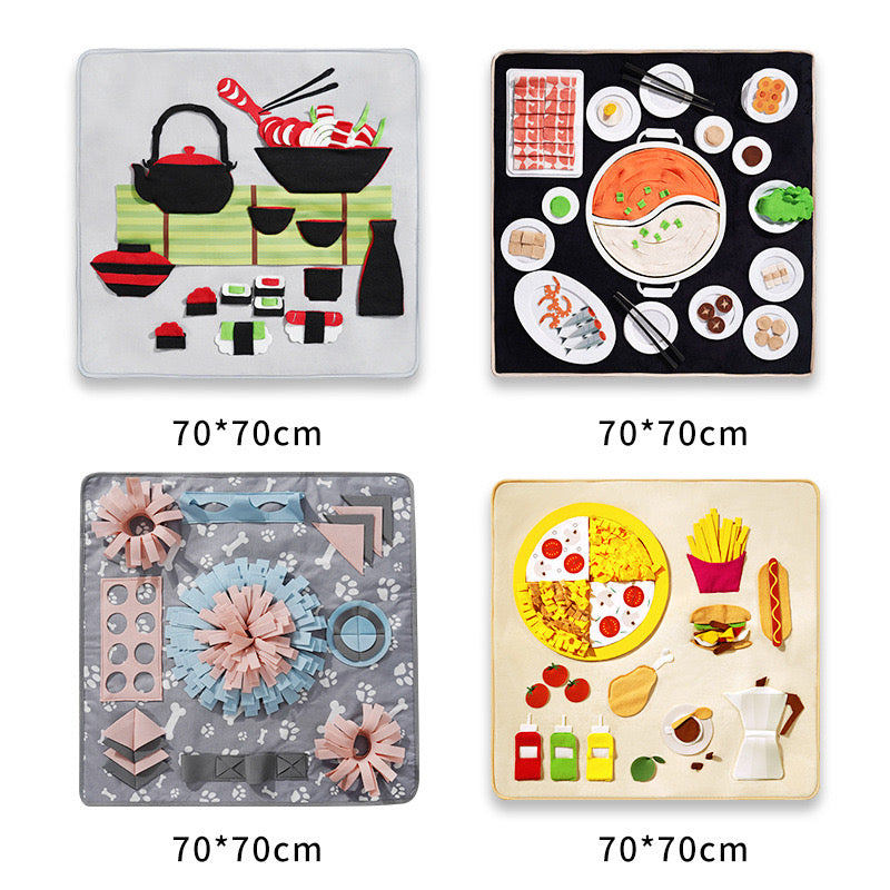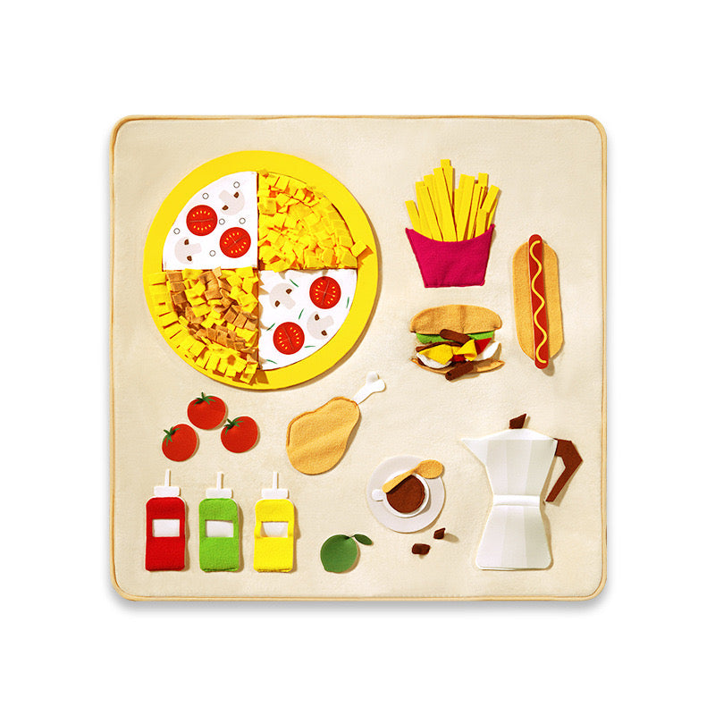 This food-themed sniffing mat toy is a delightful and interactive play accessory for pets. It features a design inspired by a delicious brunch spread, including waffles, coffee, sausage, eggs, and more. This mat incorporates bell attachments to engage your pet's curiosity and stimulate their senses.