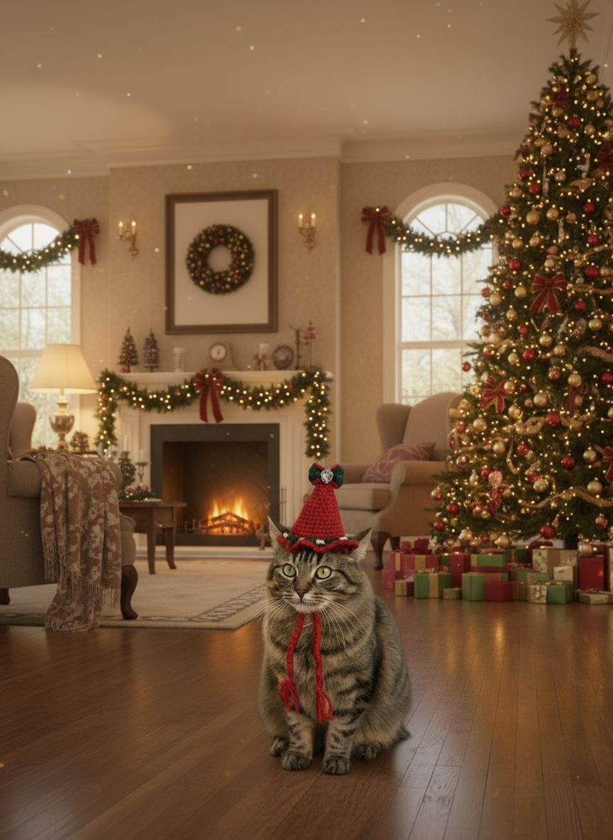 Hat fits all average size cats, small dogs. Can be decreased or enlarged to fit.